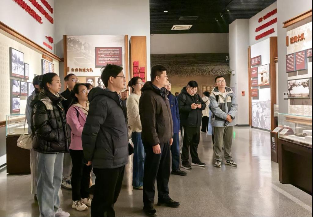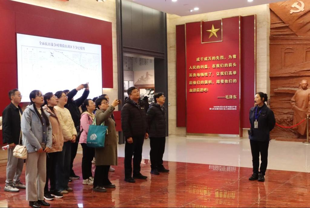 纪念馆内,党员们认真聆听讲解、观看珍贵的历史图片和文物,那段烽火岁月仿佛重现眼前。锈迹斑斑的枪支、生动的战斗复原场景,以及被誉为“枪瘤子”的鸭枪船等独特历史见证,都生动再现了铁道游击队在党的领导下英勇抗击日寇的传奇故事。参观过程中,全体人员自发唱响《弹起我心爱的土琵琶》。这首诞生于微山湖畔的革命红歌,以深情的旋律将大家的思绪带回到了那个战火纷飞的年代,歌声在馆内久久回荡,既是对革命先辈的深切缅怀,也是对铁道游击队精神的生动传承。